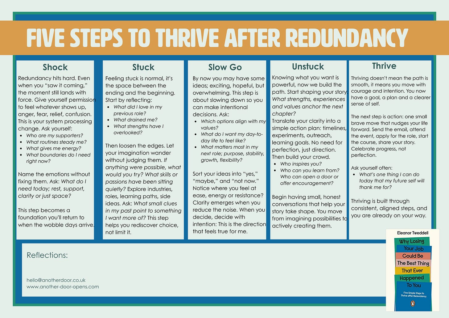 It feels like there is ‘layoffs in the air’ at the moment so I thought Id share a reminder of the 5 steps to thrive after losing your job, from my first book. I’ve included a thinking framework to help to start easing out of panic and into some calm next moves.